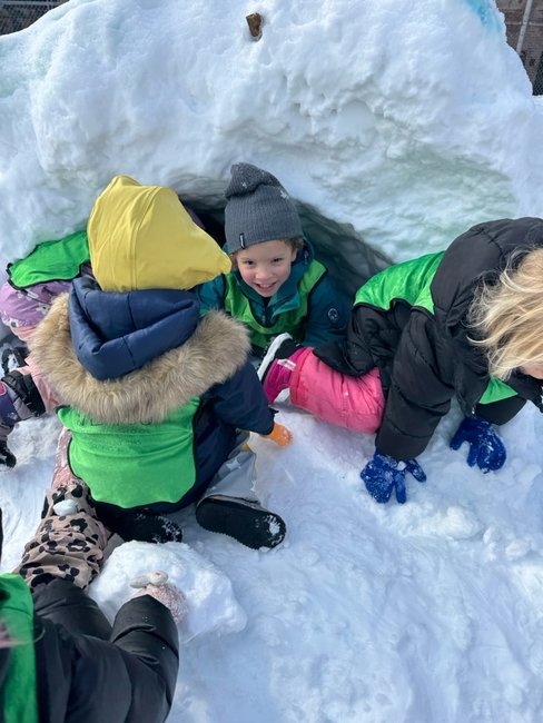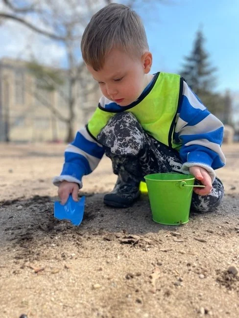 We ask that all of our students come prepared with appropriate gear to facilitate outdoor learning and exploration. We use full-body rain suits (Tuffos) and boots to keep our clothes dry while jumping in puddles. We suit up with snow pants, jackets, gloves, and hats to play in the snow. We wear our bathing suits and sun hats to get wet in the sprinklers in the summer.